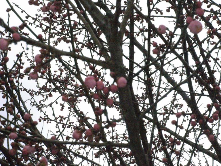 彼女自身は論文のための取材旅行に出掛けており、不在のため、一人でその大学を訪ねる。 昨年彼女に誘われて出掛けた時に、キャンパスの一角に数本の梅の木を発見した。 彼女は自分の大学に梅の木があることすら知らなかったが、たまたまその日は満開に近い咲き具合だった。 アメリカでは珍しい梅の木。 店主の梅好きを知っている妹が、梅の時期になると日本の梅の写真を送ってくれる。 例の梅が気にはなりつつも、なかなか時間がとれず、3月に入った。 もう多分終わっているだろうと、ダメもとで先週(3月8日)行ってみたところ、枝全体にふっくらした蕾が。 「まだだった!」 「間に合った!来週が満開に違いない!」 咲いているかどうかもわからないのに、「梅を見に行こう」と言って無理やり付き合ってもらった友人には申し訳なかったが、店主には収穫。 というわけで、昨日(3月15日)2度目の訪問。 満開の紅梅を想像しながら、車を走らせ、気分は紅天女。(女の人にしかわからないネタ?) 梅の木があるホフストラ大学のレクチャーセンター前まで車で近づくと、 なんだか様子が、、。 全然色づいてない~! 「もしかして、咲いて、散った?」 確かに先週も雨やら風やら不安定な天気が続いていたような、、。 一抹の不安がよぎりながらも、駐車場に車を止め、木に近づいてみると、 なんとも「微妙~」 言ってみると一部咲き? つまり、まだ殆ど咲いていなかったわけで、、、。 桜なら絶対終わってるところだが、梅はえらくゆっくり、、。 花曇の空の下、それなりに風情はあるものの、 やはり満開の梅を見たい!! 1週間で一部咲きなら、満開は10週後!? なわけはない、、。 要日々の気温チェック&感激屋店主のホフストラ梅紀行は続く。 |