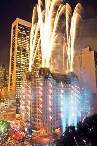 今日の100歳のお誕生日にはマチュー・ブレドリックがホストで登場、ポール・アンカがプラザのために再編曲したMy Way を自らステージで歌い、祭典のハイライトは巨大ケーキ型の花火の打ち上げ。 7時にスタートだと言うのに、オフィスを出たのが7時5分。とは言え、そのまま向かえば余裕で間に合います。が、昨日はいつになく慣れないヒールを履いており、気温も下がってきたので、靴の履き替え&上着を取りに一旦自宅に帰ることに。 道路は空いておりあっと言う間に到着したものの、この時点で7時25分。15分ほど支度にかかり、家を出たのが7時40分。 店主の予想ではイベントは2時間、9時に花火の打ち上げ。 (充分間に合う!) ふいに8時閉店の本屋に寄りたい衝動にかられ、45丁目の本屋さんにすべりこんだのがぴったり8時でした。 3分後、再度車のエンジンをかけ、Fifth Avenueが南下オンリーの為、1ブロック回ってMadison Avenueを北上。56丁目でいい具合に駐車スポット発見。出る車が少し手間取り、5分経過。得意の縦列駐車を芸術的に決め(言い過ぎ?)、さあ行くぞ、と車から出た瞬間。